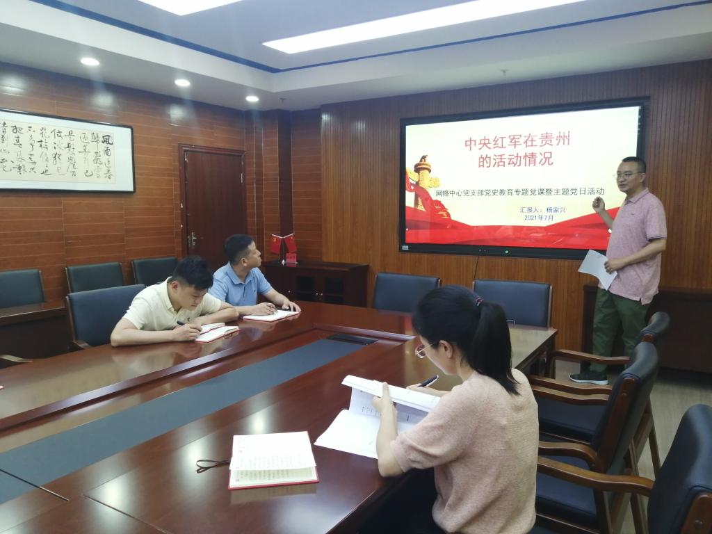 7月7日上午10点,网络信息中心党支部在行政楼5楼会议室进行党史教育专题党课学习,学习内容为《中央红军在贵州的活动情况》,学习由网络与信息中心党支部书记杨家兴主持并授课。